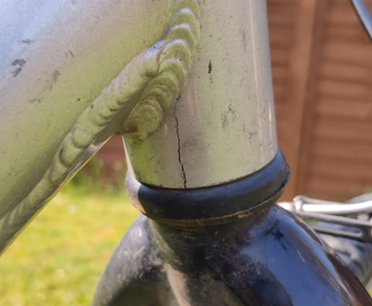 Check for cracks/dents, especially near welds and the bottom bracket.