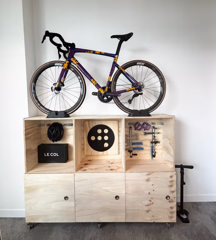 Sometimes your bike needs furniture of its own. At the Sundays office, we built a hybrid cupboard-and-bike rack to prove it can be done without taking over the room – or the budget. A few sheets of plywood (£120) and a local timber merchant who cut them to size did most of the work. A few hours with a drill took care of the rest.